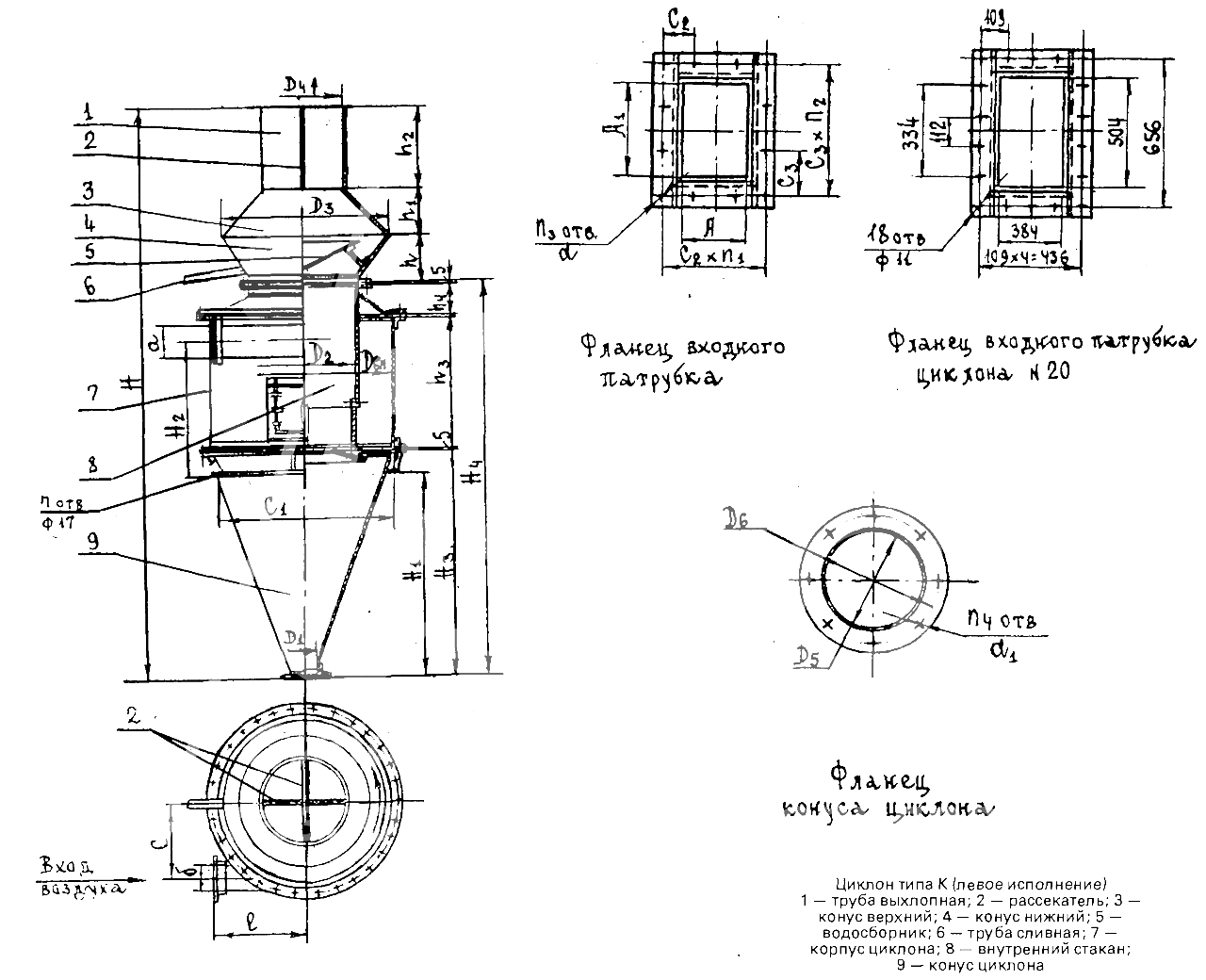Циклон К. Предназначен для применения в системах пневматического транспорта измельченной древесины с низким содержанием пыли (щепа, дробленка, кора, витая стружка, сырая стружка, сырые опилки). Циклоны типа К нашли широкое применение в деревообрабатывающей промышленности.