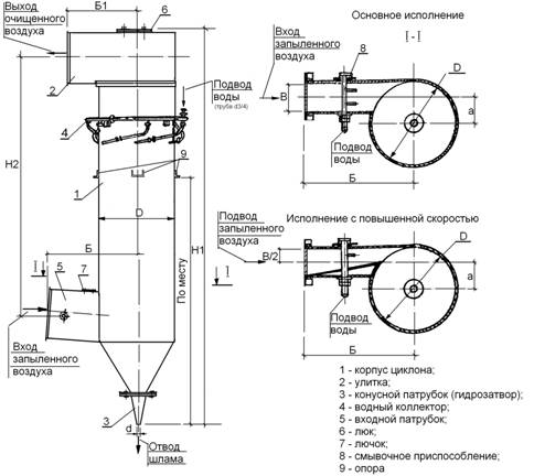 В циклоне ЦВП воздух подается тангенциально через нижний входной патрубок и удаляется через патрубок в его верхней части. Стенки циклона непрерывно смачиваются водой из сопел, размещенных в его верхней части по окружности и объединенных водораспределительным кольцом. К спускному отверстию циклона прикреплен конус, который заменяет гидравлический затвор. В подводящем патрубке циклона имеется смывное устройство для удаления пылевых отложений, образующихся в патрубке.